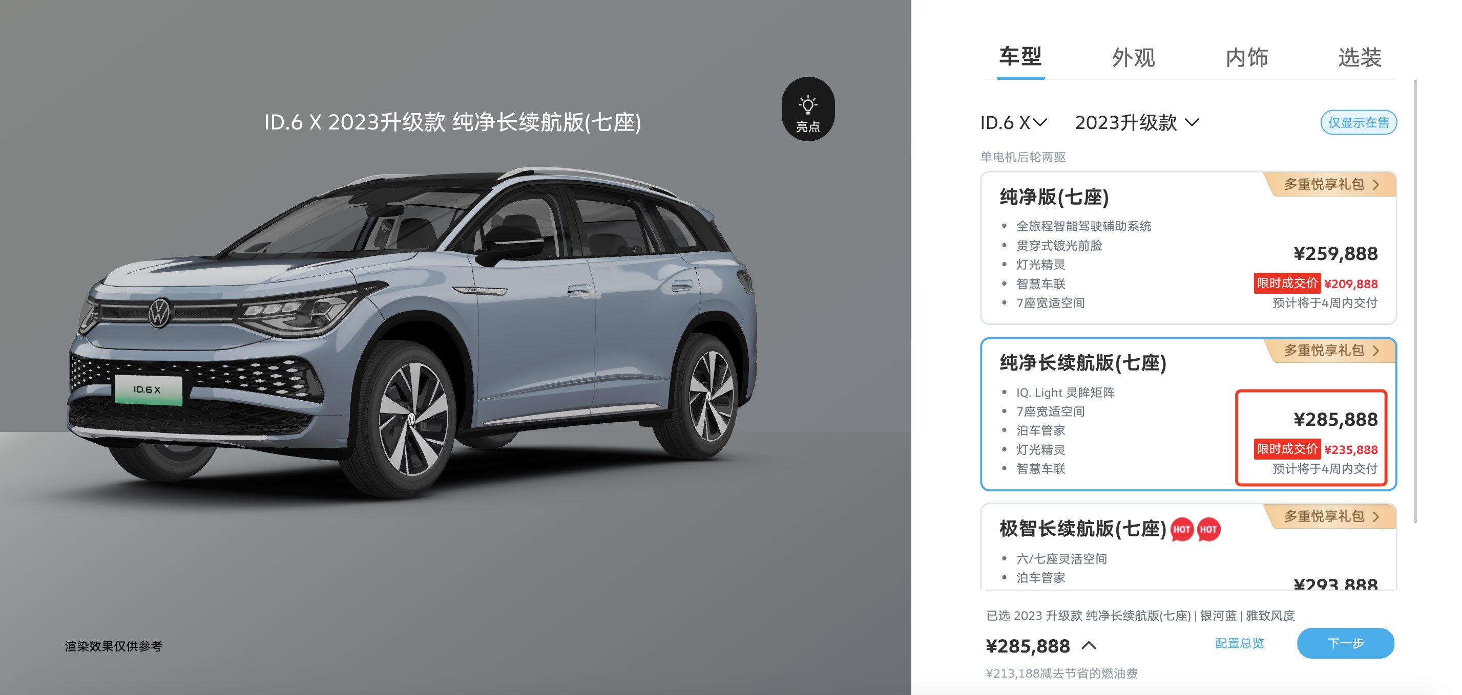 動力續(xù)航上,ID.6 X提供多種性能、續(xù)航版本,主銷車型配備寧德時代三元鋰電池,容量為83.4千瓦時,支持0.67小時快充,最高續(xù)航617公里。同樣,作為ID.家族旗艦級SUV,上汽大眾為ID.6 X推出限時優(yōu)惠,綜合優(yōu)惠至高5萬元。從官網(wǎng)顯示,ID.6 X長續(xù)航版指導價28.5888萬元,限時優(yōu)惠價格23.5888萬元,25萬元落地一款6座純電中大型SUV,是不是很誘人?