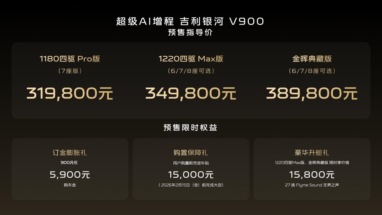 1月7日,吉利銀河旗下V系列的首發(fā)之作,“AI全場(chǎng)景家庭旗艦MPV”——吉利銀河V900正式開啟預(yù)售,共計(jì)3個(gè)版本,預(yù)售指導(dǎo)價(jià)格區(qū)間為31.98萬元~38.98萬元。新車圍繞中國大家庭出行的真實(shí)需求,以寬奢空間、豪華駕控、全維安全、AI智能幾大全能滿配實(shí)力,重新定義豪華旗艦MPV價(jià)值標(biāo)準(zhǔn),樹立AI全場(chǎng)景豪華出行新高度。