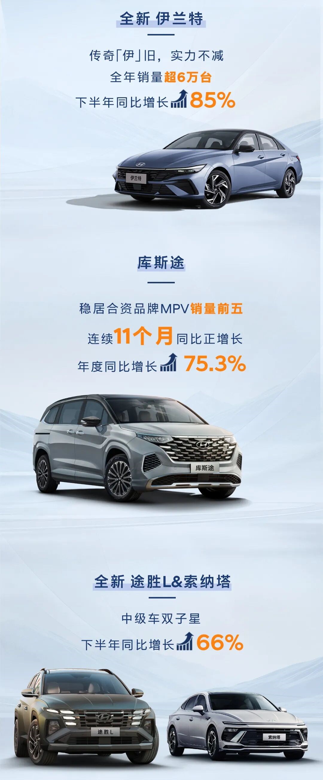 具體來(lái)看,燃油車(chē)基本盤(pán)持續(xù)夯實(shí):家用MPV車(chē)型庫(kù)斯途憑借精準(zhǔn)的市場(chǎng)定位,穩(wěn)居合資品牌MPV銷(xiāo)量前五,連續(xù)11個(gè)月實(shí)現(xiàn)同比正增長(zhǎng),年度增幅達(dá)75.3%;索納塔與途勝組成的“中級(jí)車(chē)雙子星”下半年銷(xiāo)量同比增長(zhǎng)66%,成為中級(jí)車(chē)市場(chǎng)的“中堅(jiān)力量”;經(jīng)典家轎伊蘭特延續(xù)“家轎王”口碑,全年銷(xiāo)量超6萬(wàn)輛,下半年同比增幅高達(dá)85%,以經(jīng)濟(jì)省油、皮實(shí)耐用的優(yōu)勢(shì)持續(xù)收獲家庭用戶青睞。